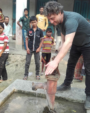 Bild links: Dr. Martin Maier am ersten AGAPE-Tiefbrunnen an der Grundschule in Goljani, der bis heute arsenfrei ist.