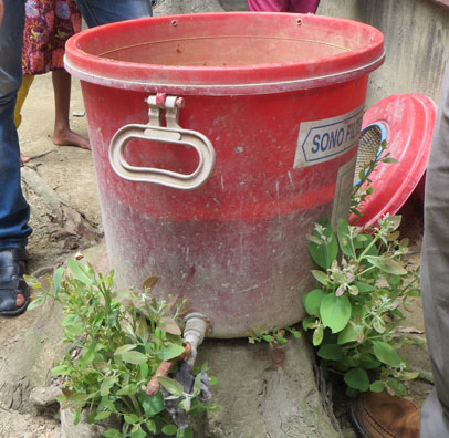 Erste Prototypen basieren auf Filtern der bengalischen Marke "Drink it". Diese Filter verfügen über einen mehrschichtigen Filter, der neben Eisen auch eine Reihe weiterer Stoffe entfernen soll. Die Eisenentferung funktioniert sehr gut, wodurch diese Filter eine hohe Akzeptanz haben. Die Mehrschichtfilterkartusche allerdings bringt keine erkennbaren Nutzen. Eine Entfernung von Arsen ist - wie vom Hersteller angegeben - nicht mögich. Daher haben wir diese marktüblichen Filter mit einer auswechselbaren Zusatzkartusche ausgestattet, die Filtermaterialen zur Entfernung von Phosphat und Arsen enthalten. Der Test läuft derzeit 6 Monate sehr erfolgreich. Es werden parallel verschiedene marktübliche Filtermaterialen getestet, die auch recycelt werden können.